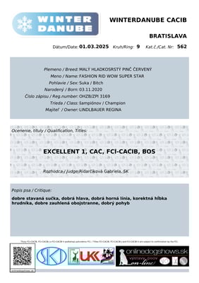 02.03.2025 Bratislava Winter Danube CACIB 2025 - Richter: Ridarcikova Gabriela (SK) - CH - V1, CAC, Res. CACIB
